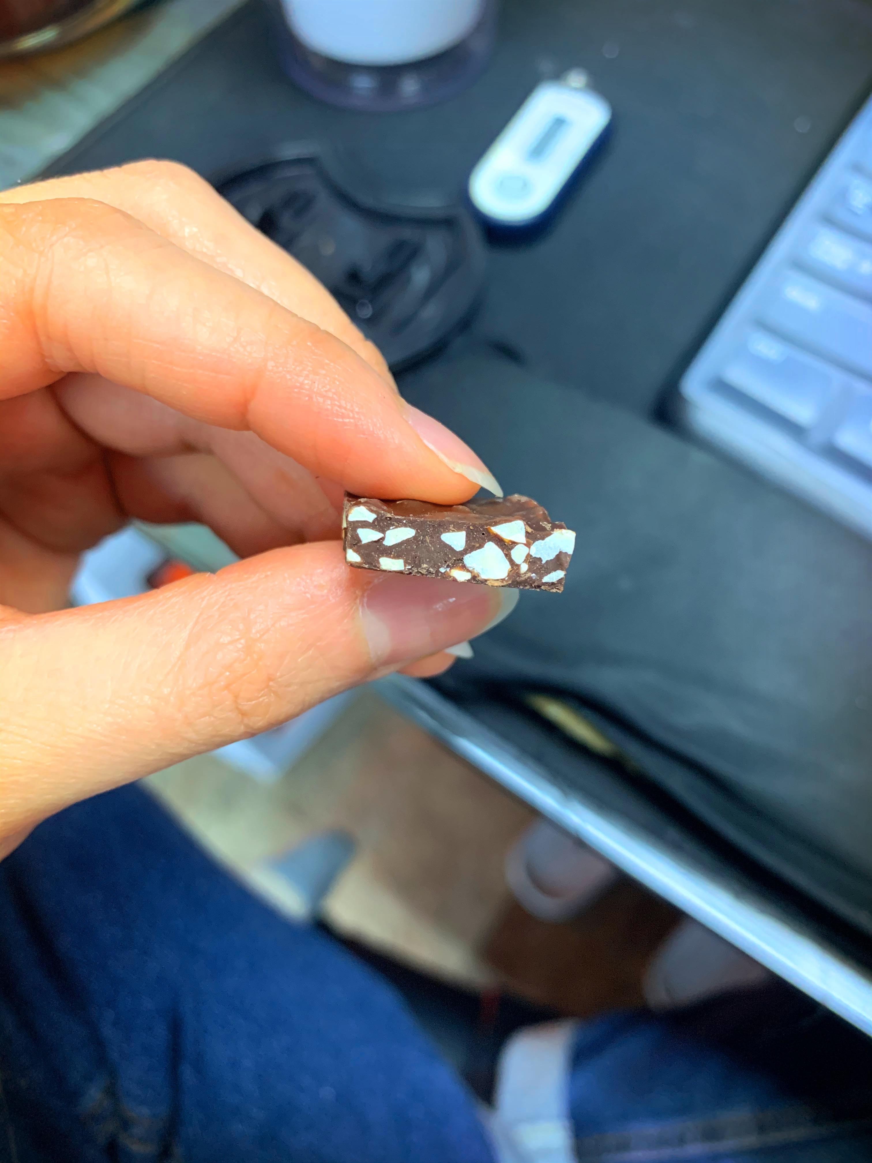 맛은 고급스럽습니다. 너무 달지않고 다크초콜렛 구성에 아몬드가 알차게 들어갔습니다.