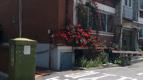 가는길 근처 주택 건물을 덮은 붉은 장미, 집주인분이 가꾸신건가...