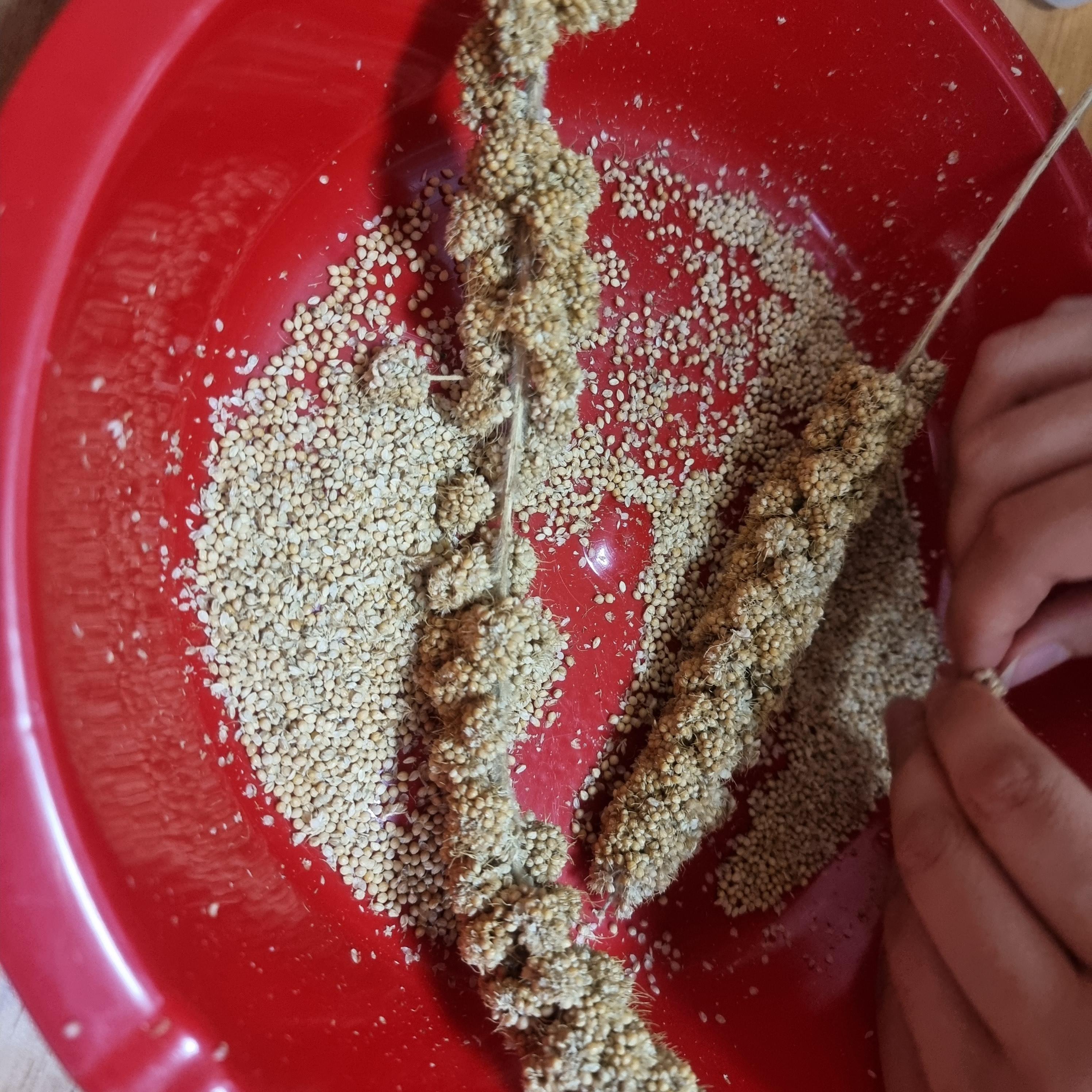 네에...그래서 저렇게 빨간대야에 밀렛줄기를 알갱이를 다 털어내고, 그걸 또 싹싹 비벼서 겉 껍질을 깠습니다.
