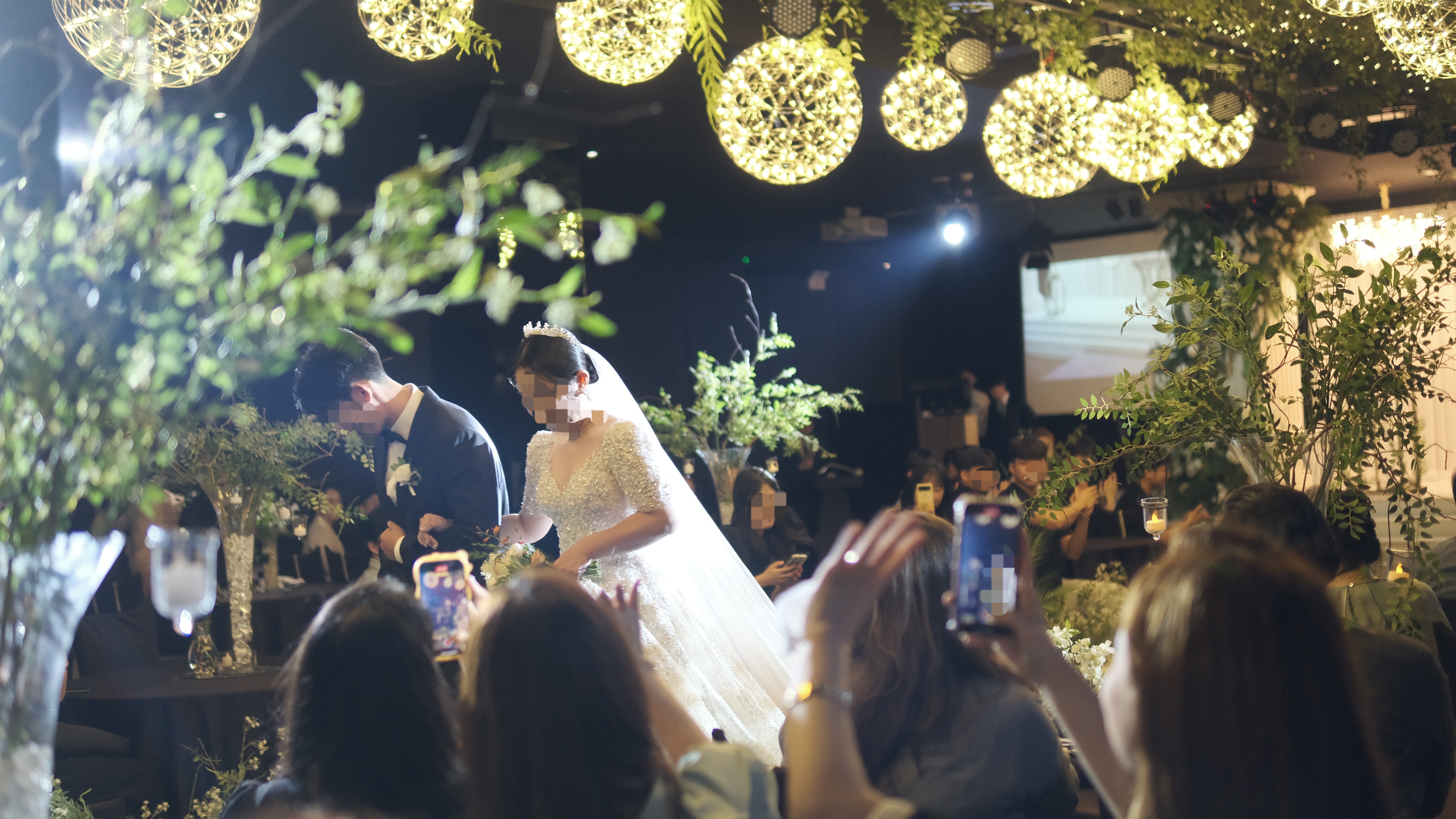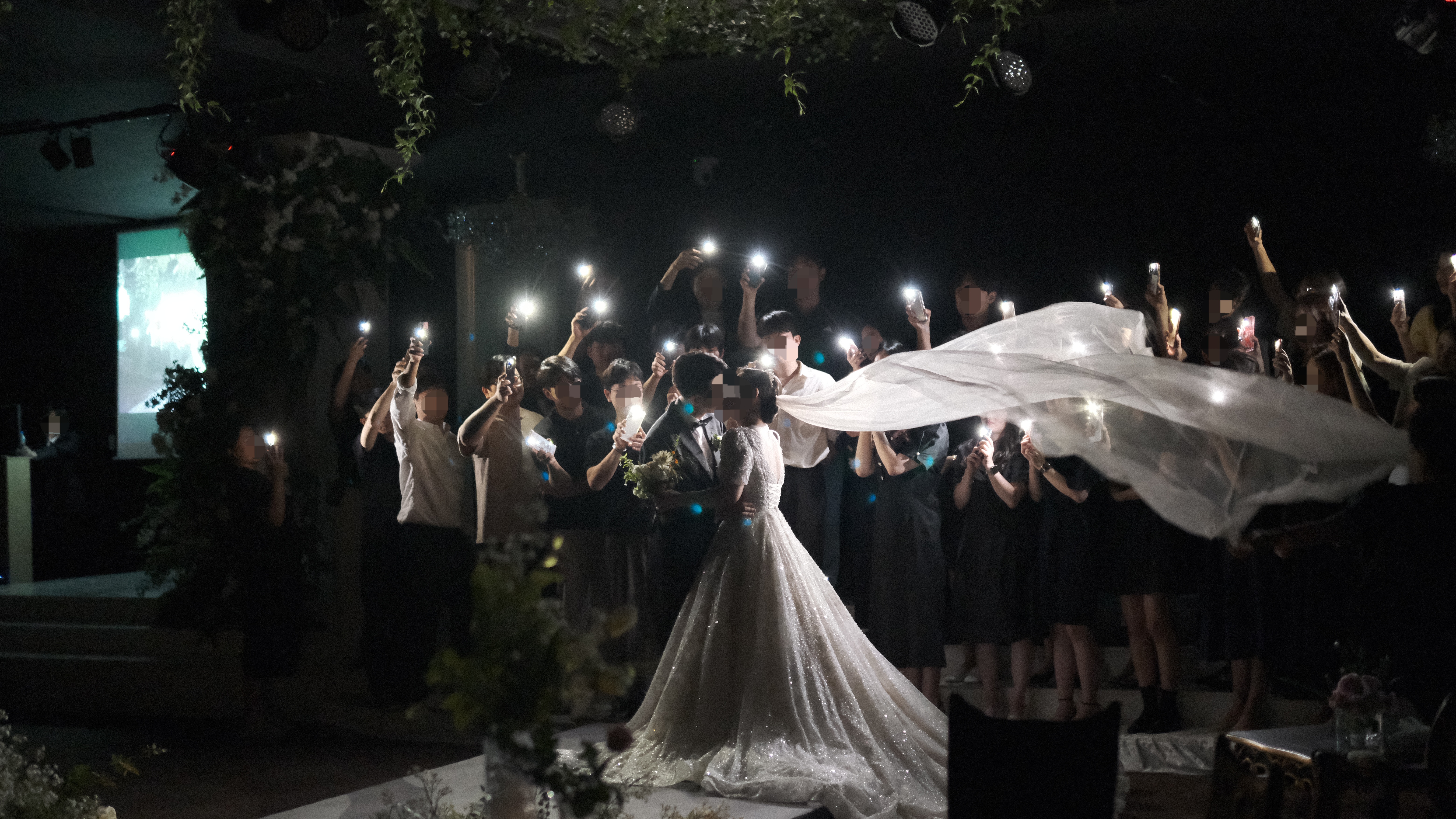 아래 모자이크해서 올려보겠지만, 신랑 신부 행진때 신랑신부 포토타임, 그리고 친구들이 핸드폰 불빛으로 비춰주면서 찍을때 등...