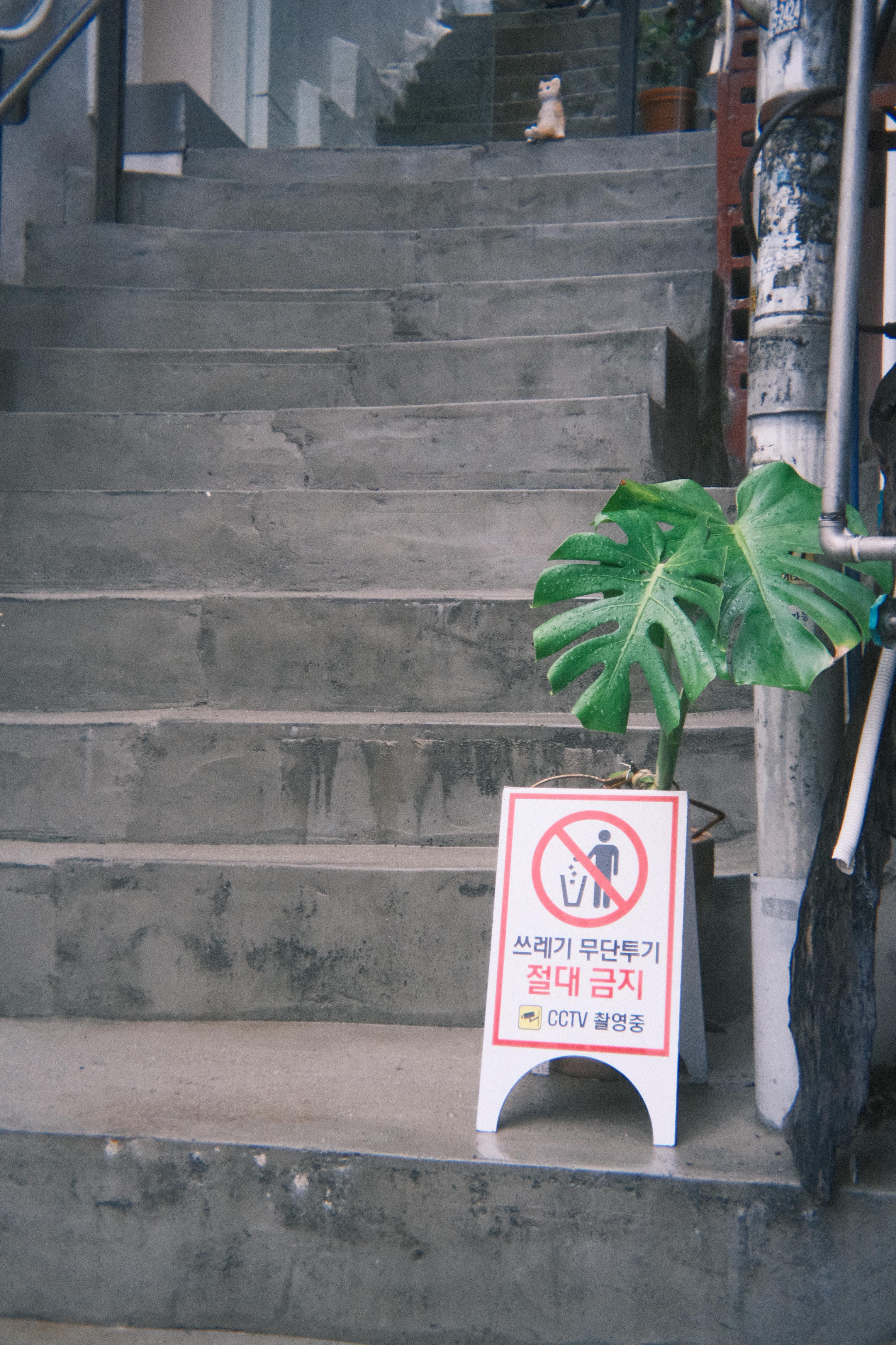 초록잎과 회색계단 그리고 저 위에 고양이 모형...